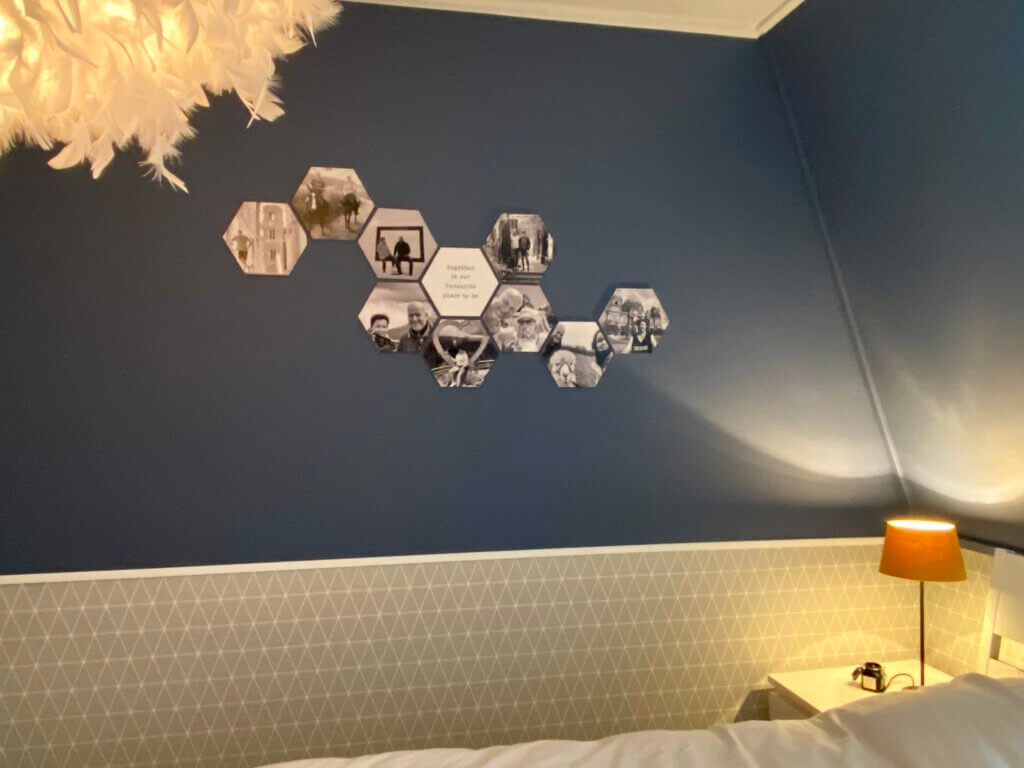 Niet in mijn huis (al voelt het wel zo) maar in de slaapkamer van vriendlief hangt een verzameling foto’s van onze vakanties samen. De foto’s zijn afgedrukt op forex plaatjes en bevestigd met magneten waardoor we deze verzameling altijd kunnen wisselen, verschuiven en uitbreiden. Er is nog genoeg ruimte op de muur. Ook hangt er bij hem een foto op canvas uit Marokko.